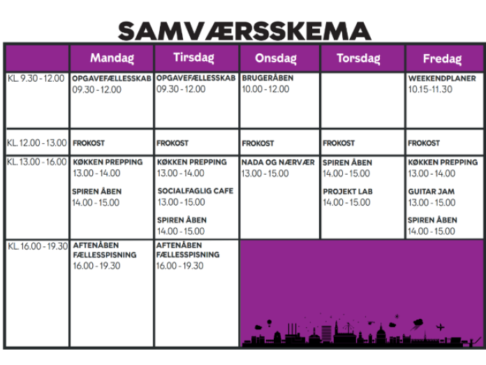 I Ungehus CPH bliver du mødt af en behagelig atmosfære, og vi har en bred vifte af sociale aktiviteter. De spænder over drop-in muligheder såsom fitness, NADA, musik og krea, til sund frokost, brætspil og opgaver i vores køkken og Café Spiren, hvor der altid er lækker mad, god kaffe og sunde snacks.